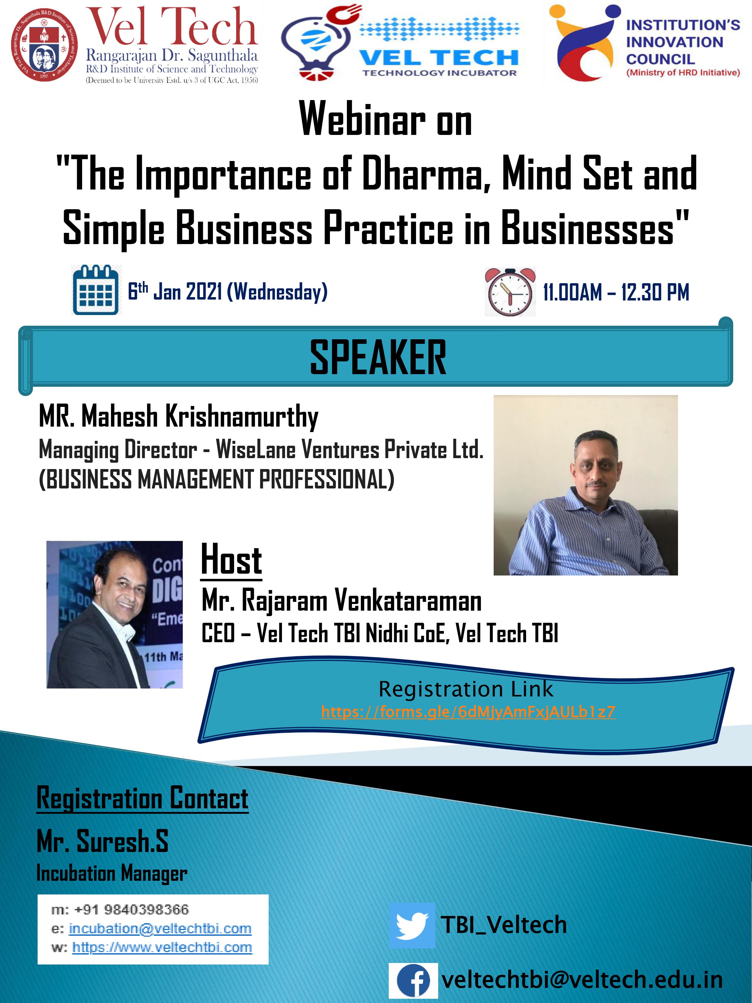The Importance of Dharma Mind Set and Simple Business Practice in Businesses 2021 VelTech HighTech DR Rangarajan DR Sakunthala Engineering College Chennai Tamil Nadu January 2021 Webinars Webinars in Chennai 2021 Webinars in Tamil NaduFeatured Events