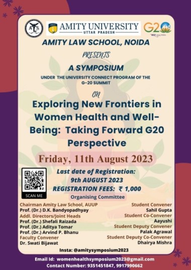 Dear Participants, we extend our warm greetings to all of you from Amity Law School, Noida. We are excited to announce the launch of our symposium event under the G-20 University Connect Program for the year 2023. The theme for this year's course is "Exploring New Frontiers in Women Health and Well-Being: Taking Forward G20 Perspective." This symposium aims to bring together experts, industry leaders, professors, and enthusiastic students to discuss and deliberate on various aspects of women's health. Designatory from Government bodies and ministries are invited for Guest of Honor for this event.