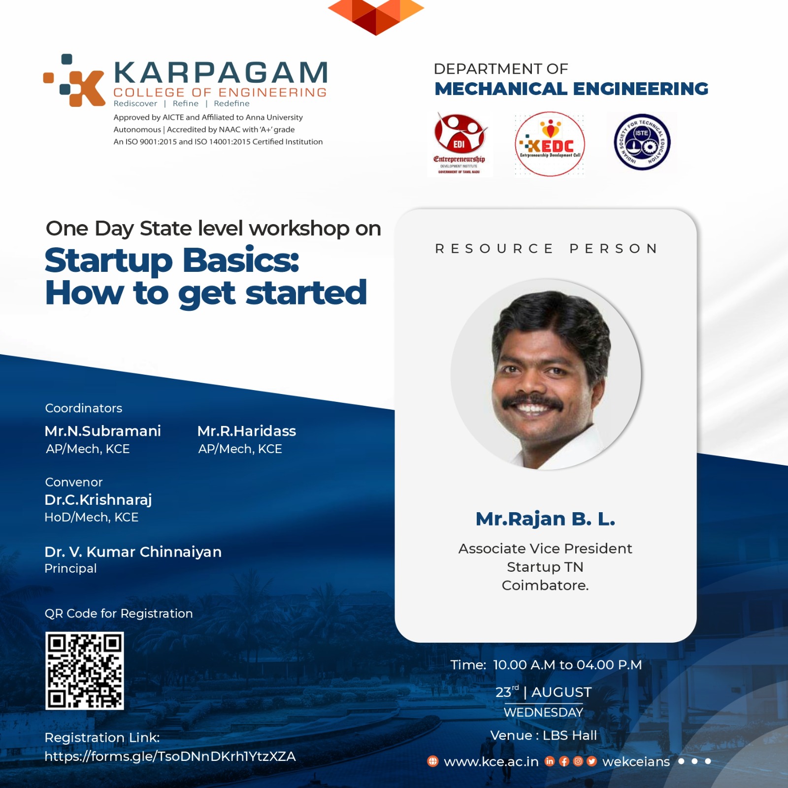 Startup Basics - How to Get Started 2023, Karpagam College of Engineering, Startup Workshop, Coimbatore, Tamil Nadu, 23rd August 2023